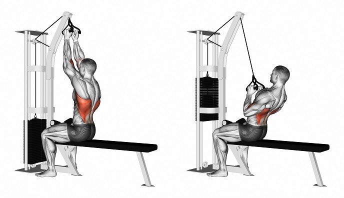 1) 광배근 강화: 랫풀다운 오버그립은 광배근을 주로 목표로 하기 때문에, 등 너비와 두께를 더해주는 데 도움을 줍니다. 이로써 V자형 체형을 강조하게 됩니다.